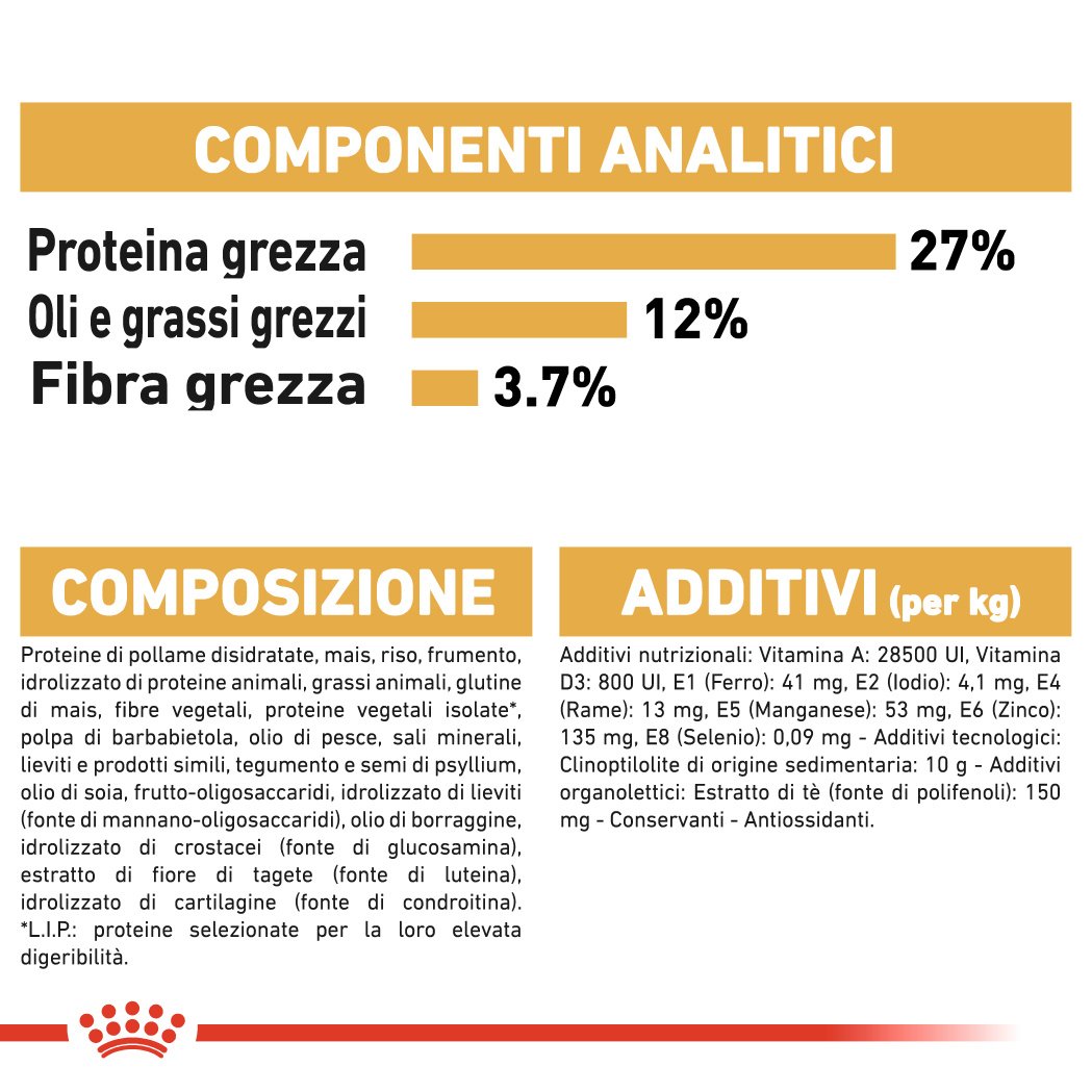 La crocchetta esclusiva unitamente al complesso di fibre contenuto, contribuisce a limitare la quantità di cibo assunto favorendo la masticazione.