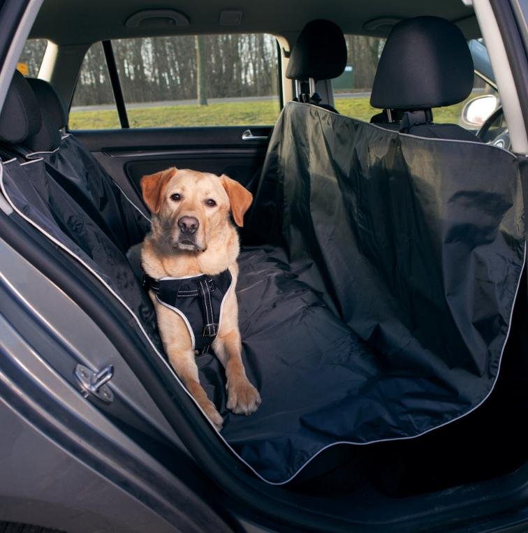 Coprisedile in poliestere per i sedili posteriori con aperture per agganciare il cane alla cintura, linguette di collegamento per il fissaggio laterale e bordi riflettenti.