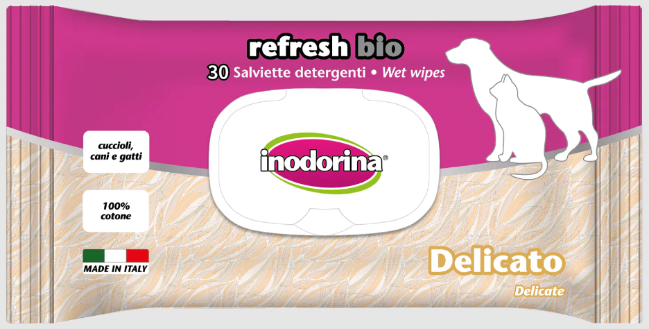Le salviette Inodorina Refresh Bio sono utilissime nei momenti di vita quotidiana con il nostro animale: prima di un viaggio in auto e al termine della passeggiata o di una gita all’aperto. Inodorina Refresh Bio è particolarmente indicata al momento del rientro in casa nei giorni di pioggia perché neutralizza le molecole di cattivo odore sul manto bagnato, lasciando il pelo deterso e profumato.