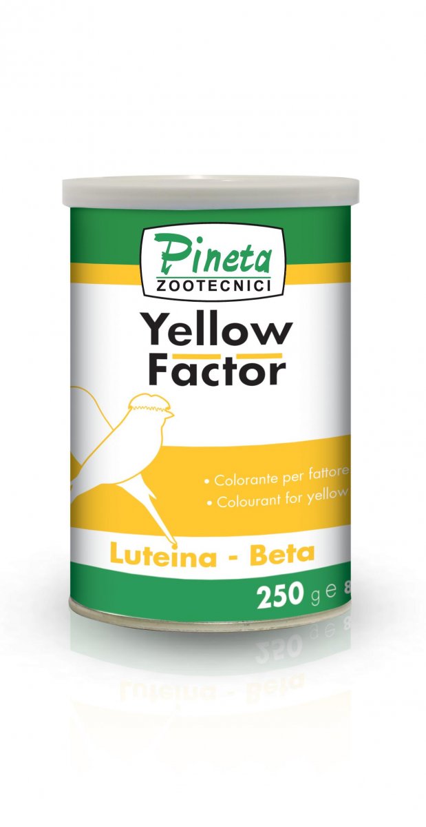 YELLOW FACTOR � un colorante specifico per canarini a fattore giallo, a base di coloranti naturali come luteina e beta-caroteni associati a fiori di cartamo per donare una colorazione giallo-oro intensa e naturale al piumaggio. Contiene estratti secchi titolati di silimarina (cardo mariano), tarassaco ed echinacea che sostengono l�organismo durante il periodo della muta, agiscono a livello epatico con un�efficace azione disintossicante ed epatoprotettiva e contribuiscono ad innalzare le le difese immunitarie. YELLOW FACTOR associato a VELL BRILL, soddisfa in modo completo ed appropriato tutte le esigenze nutrizionali degli uccelli durante il periodo della muta. Ideale anche per canarini forma e posizione (Norwich, Yorkshire, Gloster, ecc.) e per esotici(diamanti di Gould, mandarini, ecc.).