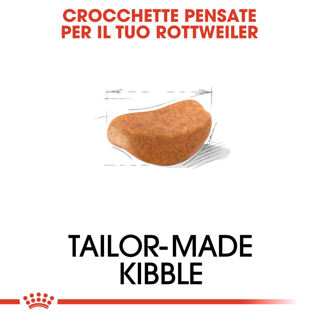 Una crocchetta esclusiva creata per facilitare la prensione ed incoraggiare la masticazione da parte del Rottweiler.