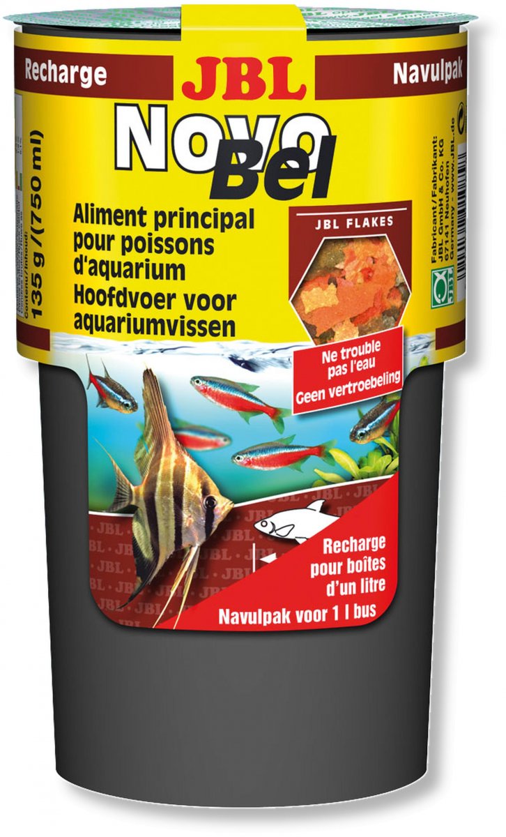JBL Novobel è una miscela bilanciata di fiocchi che contiene tutte le sostanze nutritive specifiche di cui fabbisognano i pesci ornamentali: