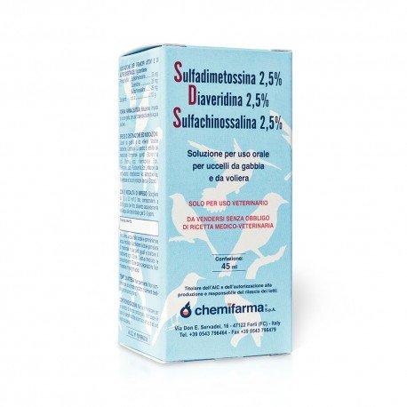 Antibiotico a base di Sulfadimetossina 2,5%, Diaveridina 2,5% e Sulfachinossalina 2,5%, specifico per uccelli ed indicato per la cura di patologie batteriche e coccidiosi.