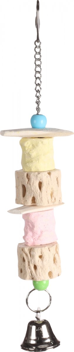 Il giocattolo per parrocchetti Puk è progettato per offrire al tuo pappagallino un’attività divertente e allo stesso tempo utile per la cura quotidiana. I materiali come gesso e osso di seppia forniscono una preziosa fonte di calcio, contribuendo a rafforzare le ossa e a mantenere il becco in ottime condizioni. Le perline colorate e il campanellino stimolano la curiosità, rendendo il gioco ancora più coinvolgente. Il sistema di sospensione in metallo consente un fissaggio semplice e sicuro alla gabbia.