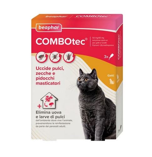 Beaphar Combotec per gatti è un antiparassitario spot-on in pipette indicato per il trattamento e la prevenzione delle infestazioni da pulci, zecche e pidocchi masticatori nel gatto. Grazie alla combinazione di due principi attivi, fipronil e (S)-metoprene, il prodotto agisce sia sui parassiti adulti sia sulle uova e sulle larve, contribuendo a interrompere il ciclo di sviluppo delle pulci e a ridurre la contaminazione dell’ambiente domestico.