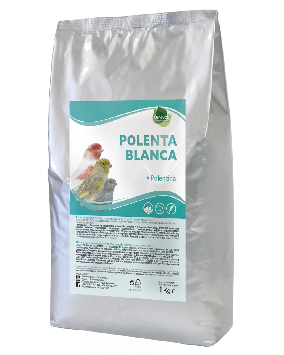 La Polenta Blanca (conosciuta anche come Polentina) è l'alleato ideale per l'allevamento professionale e amatoriale di uccelli da gabbia e da voliera, in particolare per canarini e uccelli di piccola taglia. Questo alimento complementare, a base di cereali di alta qualità e proteine di origine vegetale, è stato formulato per offrire un supporto nutrizionale eccellente, favorendo il benessere e la vitalità dei tuoi volatili.