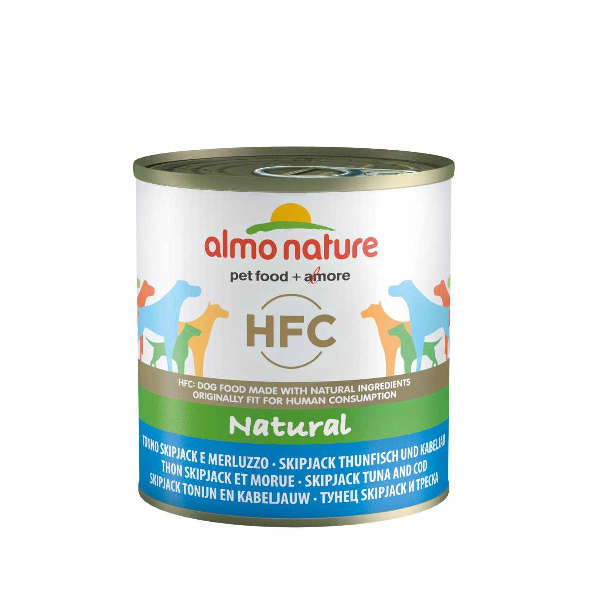 Almo Nature per cani è disponibile in lattine 290g in QUATTRO ricette per cani adulti.
