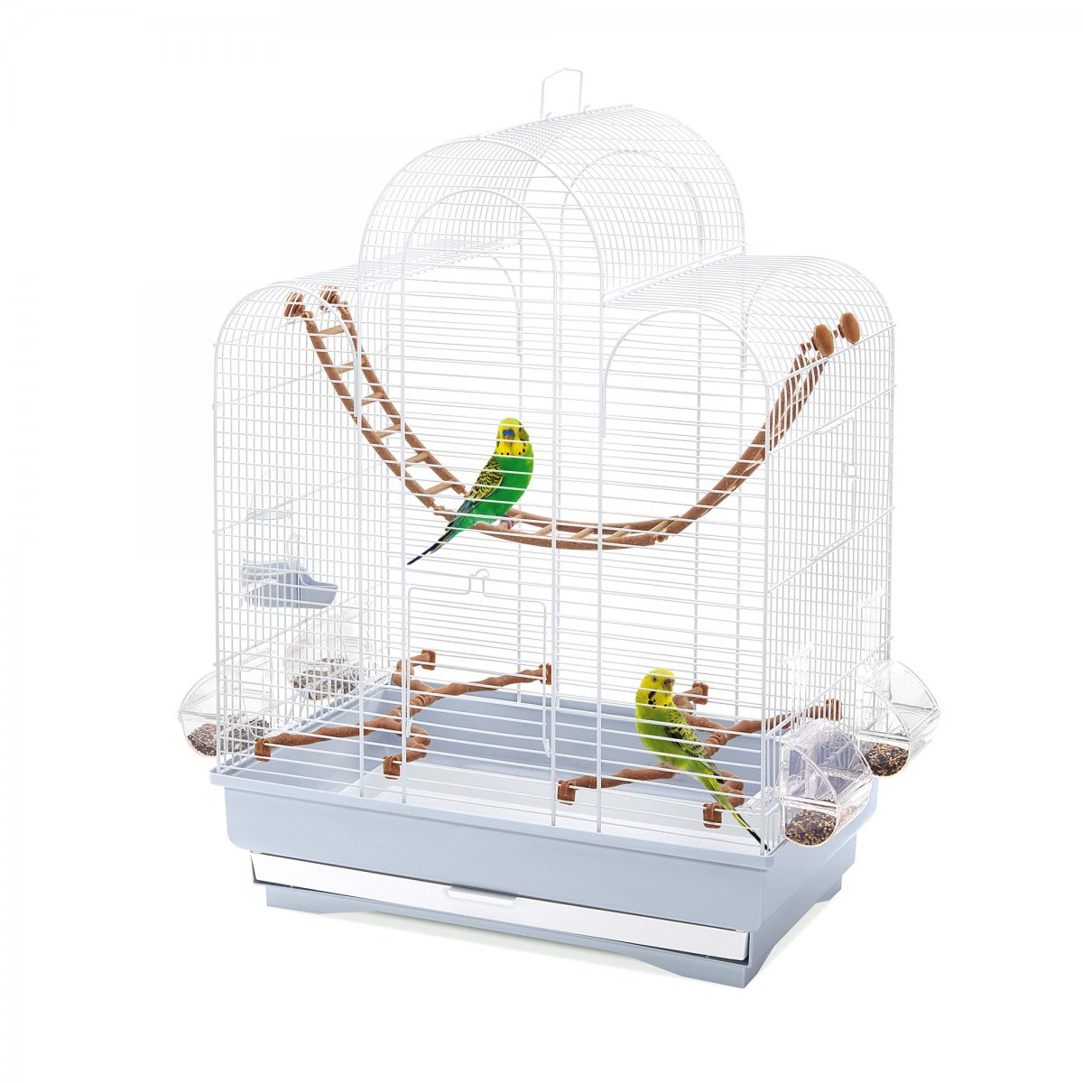 Fiona gabbia per canarini, cocorite e uccelli esotici molto bella ed elegante anche per l�abbinamento cromatico tra il bianco della rete con il colore ghiaccio del fondo in plastica. La forma del tetto arrotondato assicura grande comfort, spazio e libert� di movimento ai vostri amici pennuti. Fiona � completamente accessoriata infatti, le quattro mangiatoie Mia in plastica trasparente, il beverino Tweety 100, i due posatoi a forma di ramo e la scaletta tibetana, forniscono tutti i comfort per far divertire, mangiare e bere i vostri volatili. Dotata di un�apertura grande frontale e una pi� piccola laterale per accedere comodamente alla gabbia per le normali operazioni di manutenzione. Facile e veloce da pulire, infatti basta estrarre il cassetto e rimuovere lo sporco quotidiano. Abbina a Fiona il Portagabbie 226 bianco o blu avio, per posizionare facilmente la gabbia, in ogni angolo della tua casa, grazie alle ruote piroettanti.