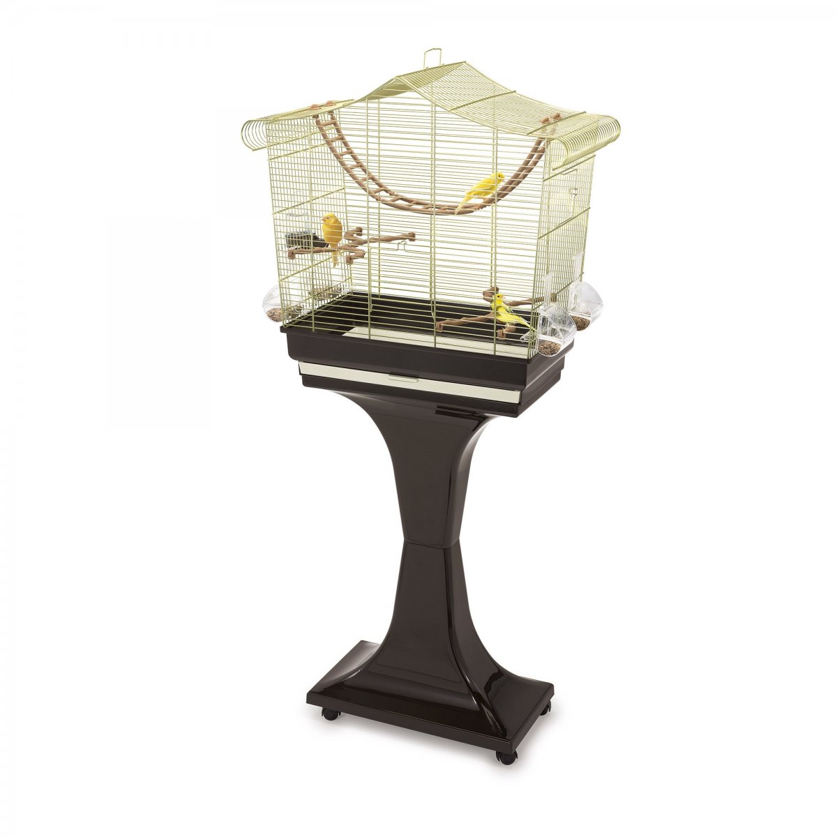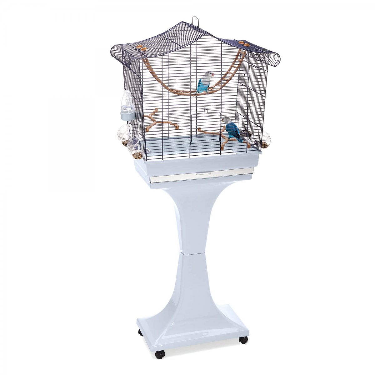 Gabbia di medie dimensioni a base rettangolare ampia dove i vostri canarini, cocoriti o piccoli esotici, potranno sentirsi a loro agio. Sofia � comprensiva di piedistallo in plastica resistente di colore blu avio per la versione della rete blu e marrone nella versione ottonata, estremamente comodo per spostare la gabbia da un luogo all�altro, grazie alle ruote piroettanti. Il cassetto estraibile, consente di rimuovere velocemente lo sporco pi� grossolano. In alternativa, per una pulizia pi� profonda, basta rimuovere il fondo, separandolo dalla gabbia metallica aprendo le clips che lo uniscono alla stessa. Inclusi nell'acquisto, troverete gli accessori che completano la gabbia: quattro mangiatoie Mia in plastica trasparente, ideali per versare cibo senza estrarle dalla gabbia e senza il rischio di far scappare l�uccello, un beverino Tweety 100, due posatoi a forma di ramo e una scaletta tibetana per far divertire o riposare i vostri amici volatili.