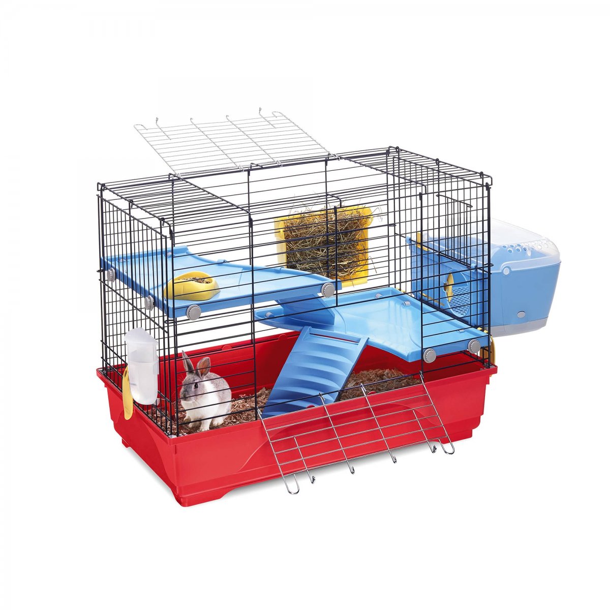 Benny 80 la dimora ideale per conigli, cavie, cincill� e furetti. Bella, colorata questa gabbia accoglier� i vostri amici offrendo spazio, sicurezza e tranquillit�. La profondit� della vasca in plastica permette all'animale di scavare evitando lo spargimento della lettiera all�esterno. Una struttura in rete metallica verniciata di colore blu � facilmente sganciabile/agganciabile al fondo, tramite due clip laterali, per effettuare una quotidiana manutenzione. Raggiungere il vostro animale o inserire il cibo all�interno della gabbia, sar� un�operazione molto semplice grazie alle ampie aperture, una frontale e una superiore. Due ripiani agganciati alla rete e collegati al fondo, creano l�habitat perfetto per permettere al vostro roditore di mangiare, giocare e riposare in totale sicurezza e con il massimo comfort. Benny 80 include i seguenti accessori: ciotola in plastica Fun Bowl, mangiatoia esterna per il fieno Feel e il beverino Bibber 400 con pratico aggancio alla rete. Completa questa accogliente dimora, Sweet Home la casetta collegata al ripiano della gabbia tramite la portina laterale, per offrire al tuo roditore pi� spazio per vivere, rilassasi, dormire. Sweet Home ha il tettuccio apribile, un cassetto estraibile per tenerla sempre pulita ed � dotata di porta di chiusura per separarla dalla gabbia. Disponibile come optional il Portagabbie 80 per spostare comodamente la gabbia, grazie alle ruote piroettanti. Ronny 80 � una gabbia facilmente assemblabile ed � realizzata con il sistema salva-spazio per farti risparmiare sui costi di trasporto e stoccaggio.