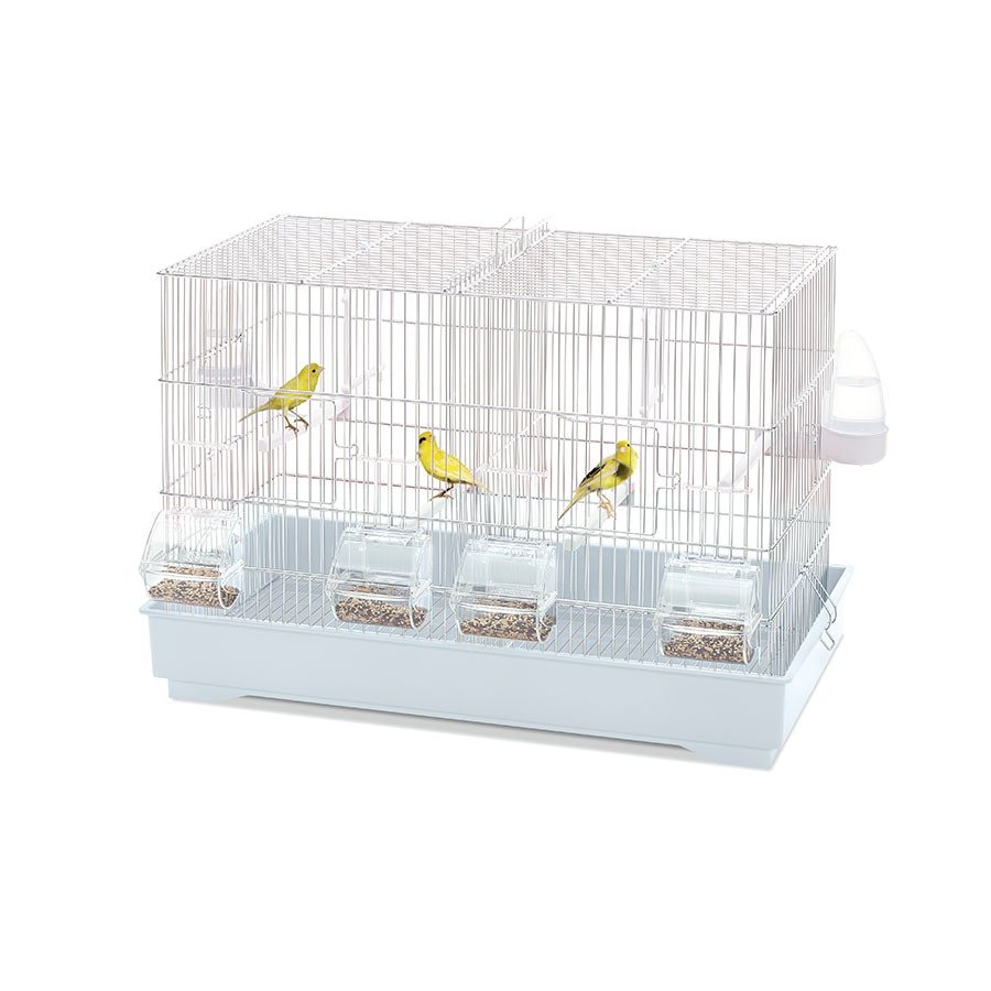 Misura intermedia della serie, Cova 55 � adatta a canarini e piccoli esotici. Ideale per allevare e svezzare i piccoli e grazie al divisorio incluso, di creare due habitat quando c�� la necessit� di separare gli uccelli. La pulizia dello sporco e degli escrementi risulter� facilitata dalla griglia anti-sporco, che permetter� di separare la struttura dal fondo in totale sicurezza, evitando eventuali fughe dei vostri amici pennuti. Cova 55 � una gabbia con struttura in rete metallica zincata, agganciata tramite due comode clip laterali al fondo in plastica di colore blu avio. Quattro mangiatoie Mia ti permetteranno di rifornire facilmente di mangime dall�esterno. Due beverini Twetty e i posatoi completano questa gabbia essenziale ma comoda.