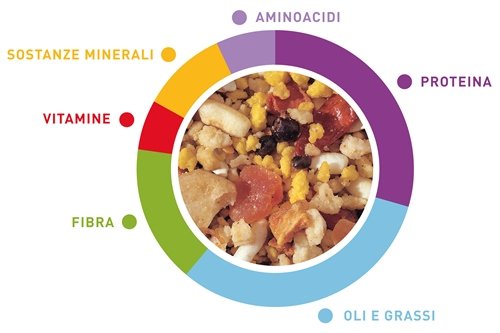 Pastoncino da somministrare in associazione all’alimento di base, per aumentare la disponibilità di nutrienti in particolari fasi di vita degli uccelli granivori (muta e riproduzione) o in periodi in cui l’animale è sottoposto a stress. Utile anche come complemento alla dieta di tutti i giorni.