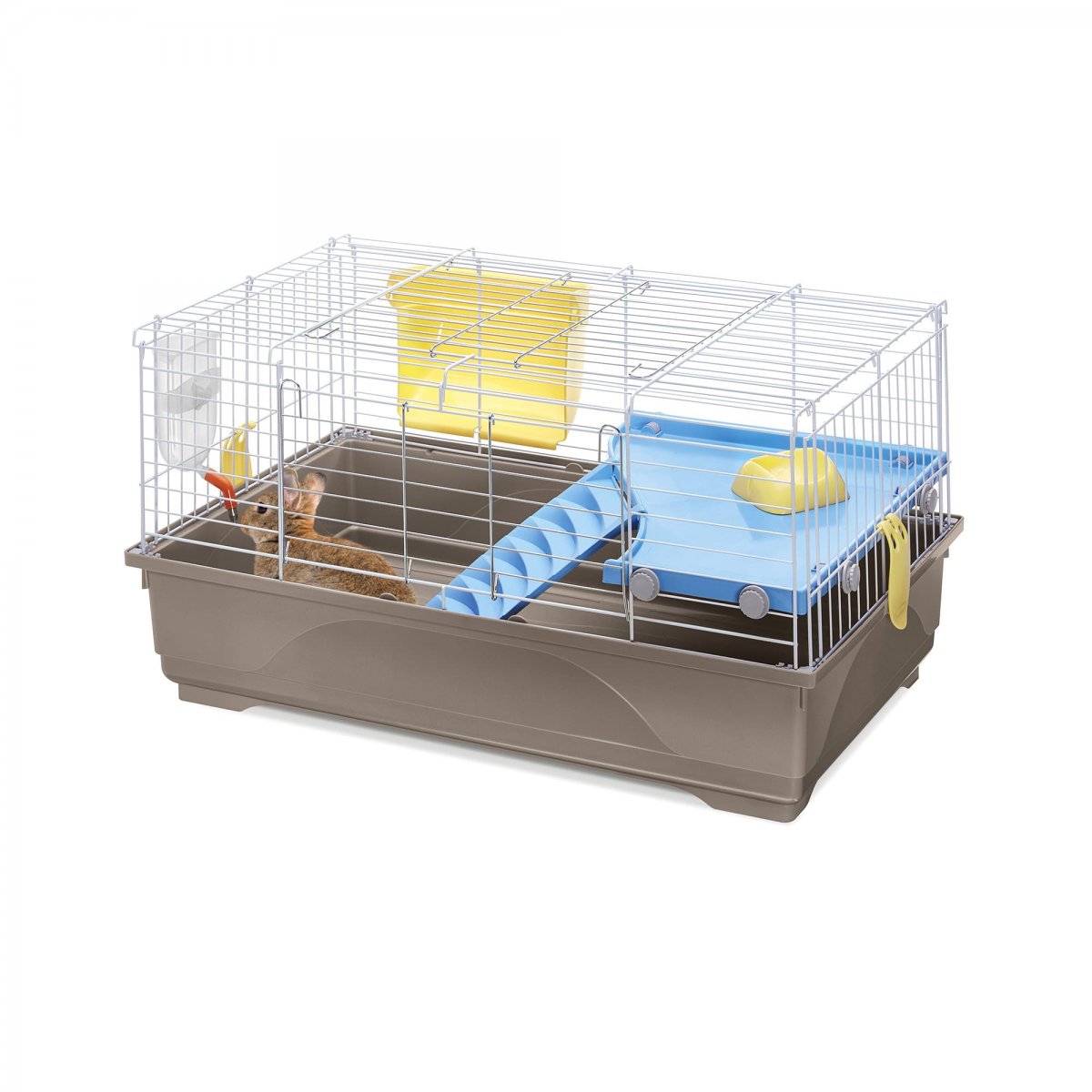 Ronny 80 gabbia per conigli e cavie con capiente fondo in plastica e struttura in rete metallica. Dispone di due grandi porte sulla parte frontale e superiore per poter accedere comodamente alla parte interna della gabbia, per inserire il cibo e per le normali operazioni di manutenzione. Un ripiano in plastica collegato al fondo con una scaletta permette al tuo roditore di avere pi� spazio per il suo divertimento e relax. Completano la dotazione interna gli accessori quali la ciotola in plastica Fun Bowl, la mangiatoia esterna per il fieno Feel e il beverino Bibber 400 con pratico aggancio alla rete.