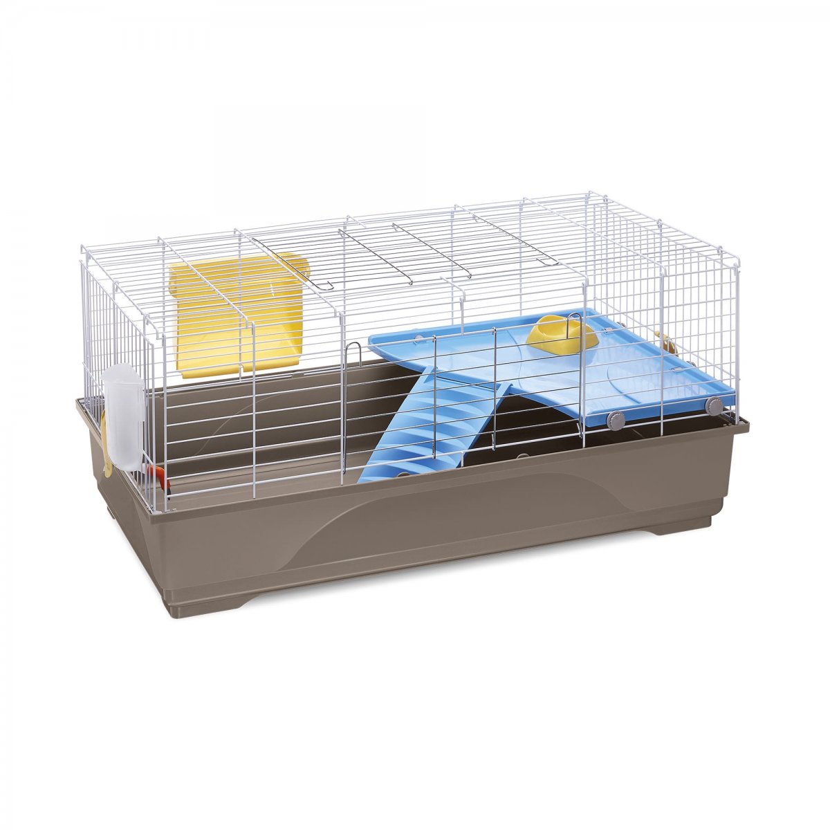 Della serie Ronny la 100 � la gabbia intermedia, di medie dimensioni per conigli e cavie. Il fondo in plastica particolarmente capiente per contenere la lettiera, � unito tramite due comode clip alla struttura in rete metallica verniciata. L�habitat � dotato di un ripiano interno in plastica agganciato alla rete, accessibile dal fondo tramite una comoda scaletta. Completano la dotazione interna gli accessori quali ciotola in plastica Fun Bowl, mangiatoia esterna per il fieno Feel e il beverino Bibber 400 con pratico aggancio alla rete. Le due ampie aperture, una superiore e una frontale, vi consentono di raggiungere facilmente il vostro animale all�interno della gabbia.
