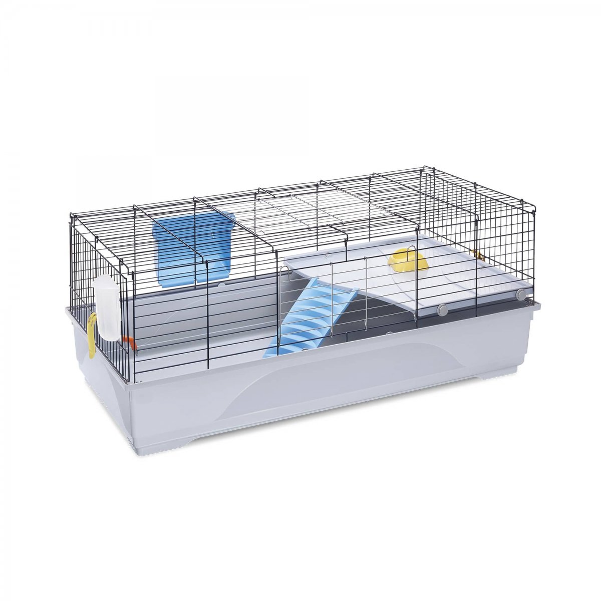 Ronny 120 � una gabbia per conigli e cavie dalle dimensioni importanti per ospitare anche pi� di un animaletto. Il vostro roditore avr� tutto lo spazio che vuole per le sue attivit� quotidiane. Il fondo � realizzato in robusta plastica ed � abbastanza capiente da contenere la lettiera, evitando fuoriuscite. Tramite i due ganci laterali, � possibile staccare il fondo dalla struttura in rete metallica verniciata, agevolando in questo modo le periodiche operazione di pulizia. Completa l�habitat di questa dimora confortevole e sicura, un ripiano in plastica agganciato alla rete, collegato al fondo tramite una comoda scaletta. Due grandi portine, una frontale e una superiore, ti permetteranno di accedere facilmente alla gabbia per le normali operazioni di pulizia o per inserire il cibo. Ronny 120 � una gabbia ricca di accessori per il massimo comfort dei vostri piccoli amici: ciotola in plastica Fun Bowl, mangiatoia esterna per il fieno Feel e il beverino Bibber 400 con pratico aggancio alla rete.