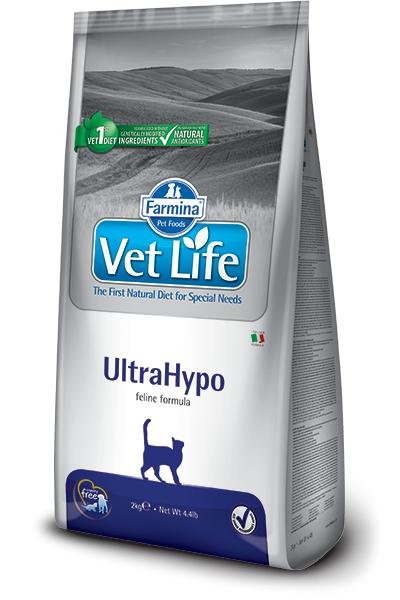 Farmina Vet Life UltraHypo è un alimento dietetico completo per gatti affetti da reazioni avverse agli alimenti (allergie e intolleranze alimentari). Può essere usato come strumento diagnostico (dieta da eliminazione); è consigliato in corso di disturbi infiammatori cronici dell'intestino (IBD), vomito ricorrente.