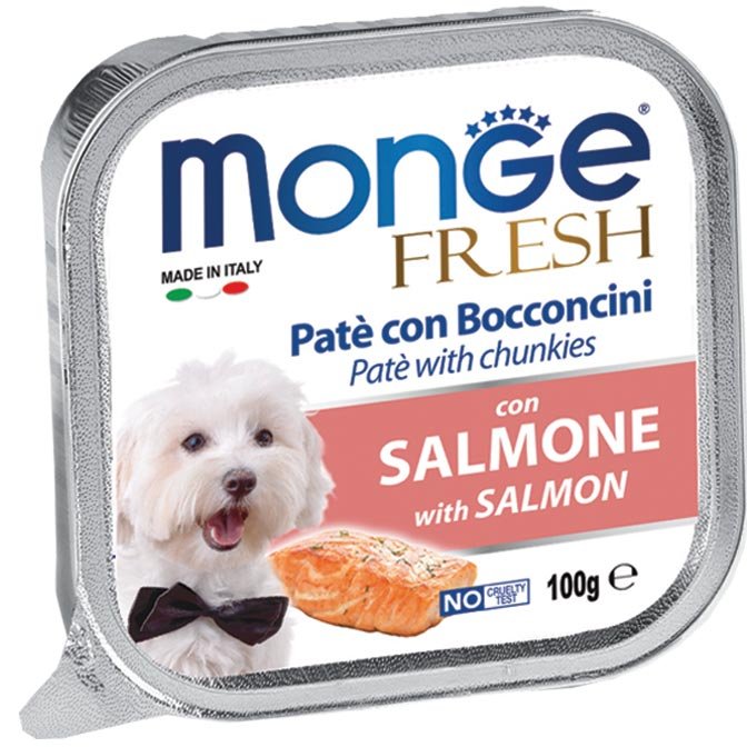 Monge Superpremium Fresh Paté e Bocconcini di cibo umido per cani ha un cuore di prelibati bocconcini con carne fresca selezionata, senza coloranti, conservanti e grassi idrogenati e a basso tenore di zuccheri, per offrire al tuo Fido il benessere quotidia