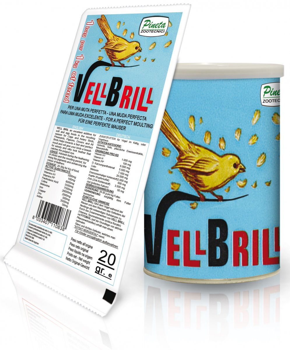 VELL BRILL vitamine e oligoelementi indispensabili per l�implumo e il reimplumo, sostanze essenziali e basilari per la muta, che favoriscono il fissaggio dei pigmenti, esaltano i colori e donano un piumaggio morbido, serico e vellutato.