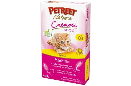 Lo snack per gatti Petreet � un delizioso spuntino cremoso realizzato con pregiato cane di pollo o di tonno accompagnati da verdura, come carote e piselli.