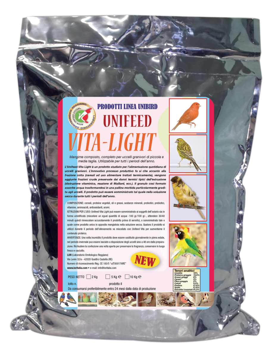 L�Unifeed-Vita Light � un prodotto studiato per l�alimentazione quotidiana di uccelli granivori. L�innovativo processo produttivo fa si che accanto alla frazione cotta (cereali ad uso alimentare trattati termicamente), vengono aggiunte frazioni crude preservate dai danni termici tipici dell�estrusione (distruzione vitaminica, reazione di Maillard, ecc.). Il granulo cos� formato assorbe acqua trasformandosi in una pallina morbida particolarmente gradita agli uccelli. Il prodotto pu� essere somministrato tale e quale nella soluzione secca durante tutti i periodi dell�anno.