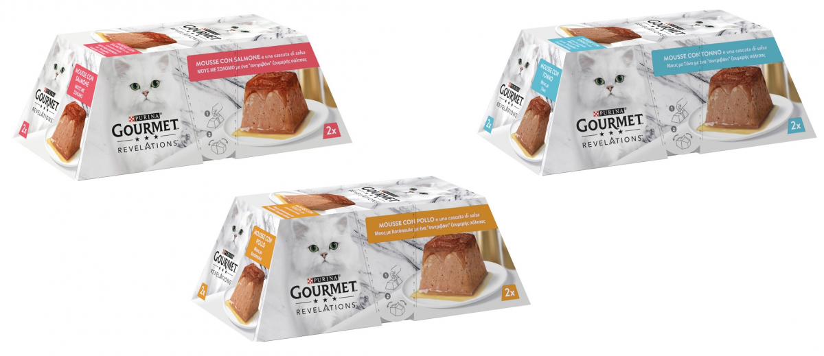 Ogni delicata e raffinata mousse � preparata con ingredienti selezionati di qualit� e guarnita da una cascata di squisita salsa, per offrire al tuo gatto un�esperienza di gusto senza paragoni. GOURMET� REVELATIONS�: una sublime prelibatezza, raffinatamente servita.