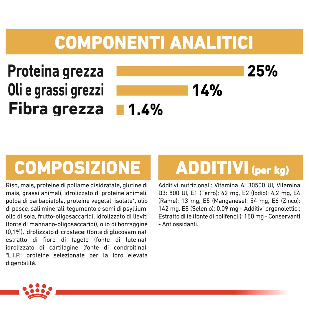 Riso, mais, carni di pollame disidratati, grassi animali, proteine vegetali isolate, idrolizzato di proteine animali, glutine di mais, polpa di barbabietola, olio di pesce, sali minerali, oli vegetali (soia, borragine), frutto-oligosaccaridi, tegumento e semi di psyllium, polifosfato di sodio, idrolizzato di lieviti, L-tirosina, taurina, uova in polvere, L-lisina, idrolizzato di crostacei, estratto di fiore di Tagete, estratti di t� verde e di vinacce, L-carnitina, idrolizzato di cartilagine.