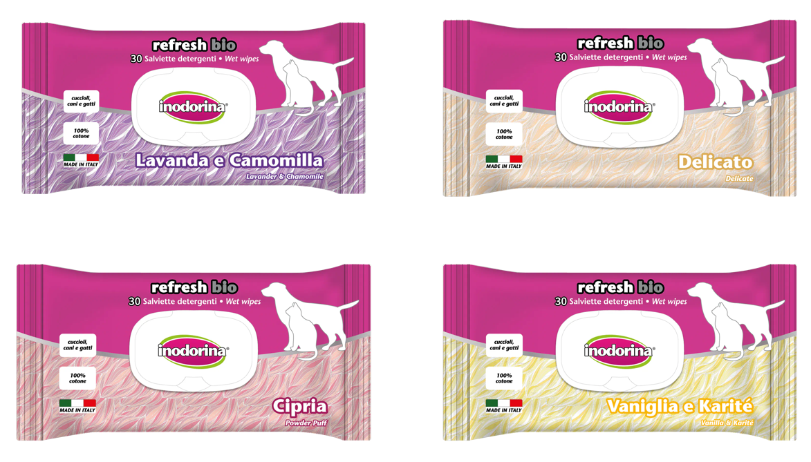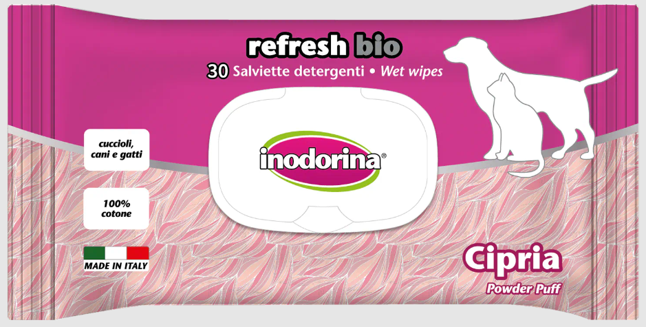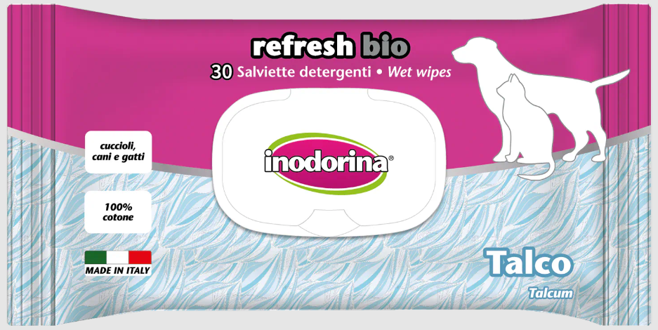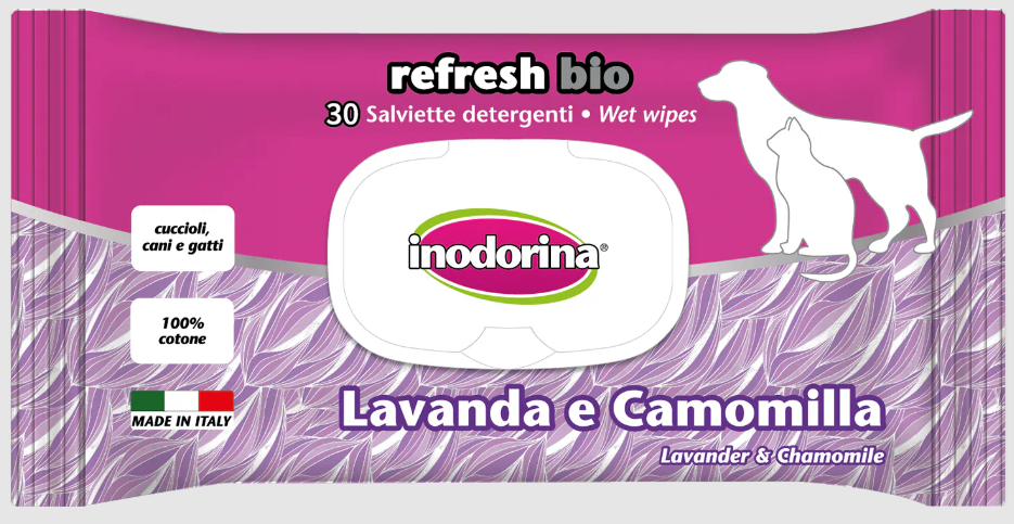 Le salviette Inodorina Refresh Bio sono utilissime nei momenti di vita quotidiana con il nostro animale: prima di un viaggio in auto e al termine della passeggiata o di una gita all’aperto. Inodorina Refresh Bio è particolarmente indicata al momento del rientro in casa nei giorni di pioggia perché neutralizza le molecole di cattivo odore sul manto bagnato, lasciando il pelo deterso e profumato.