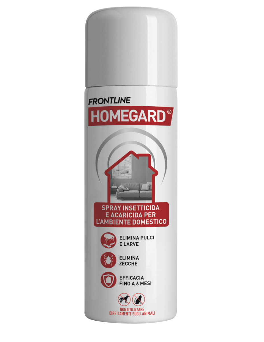 Frontline Homegard Spray è uno spray in aerosol per il trattamento, in ambiente chiuso, dei mobili non lavabili, tessili per la casa come tappeti, stuoie e poltrone.