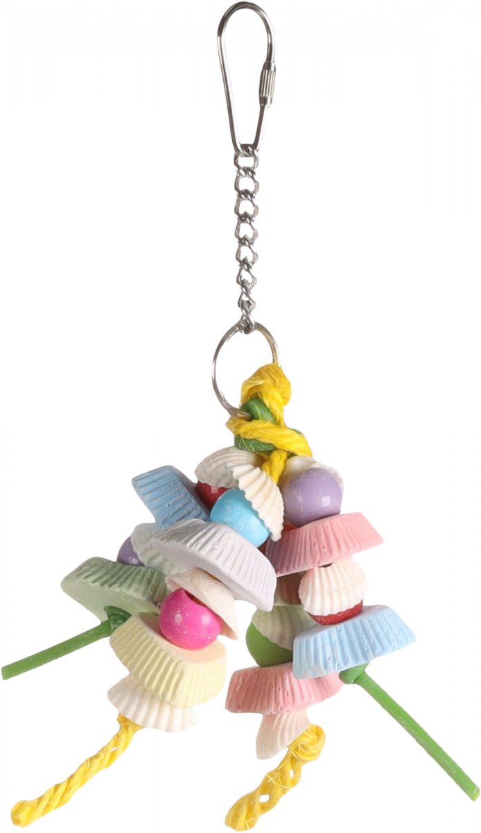 Il giocattolo per parrocchetti Caly è progettato per stimolare l’attività e la curiosità del tuo pappagallino. Realizzato in gesso, conchiglie e cuoio, offre texture diverse e materiali naturali da mordicchiare, mentre le perline e le corde colorate rendono il gioco più coinvolgente. Il sistema di sospensione in metallo permette un fissaggio semplice e sicuro alla gabbia.