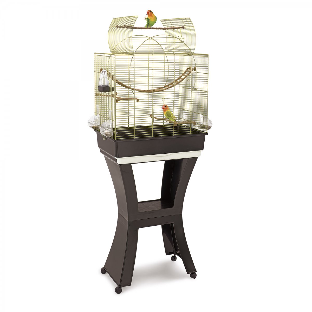 Matilde gabbia per canarini, cocorite e uccelli esotici comprensiva di piedistallo con ruote piroettanti. La caratteristica di questa gabbia e il tetto tondeggiante apribile. Posizionando il posatoi a forma di ramo tra le due aperture questa gabbia diventa un rifugio per i vostri uccelli, liberi di volare via e di rientrare alla base a loro piacimento. Disponibile nei due abbinamenti di colore: rete ottonata con fondo e piedistallo in plastica marrone, oppure rete zincata e fondo e piedistallo in plastica colore ghiaccio. Per una praticissima pulizia della gabbia basta estrarre il cassettino dal fondo, mentre per accedere all�interno per una ordinaria manutenzione, Matilde dispone di tre aperture, una frontale e due laterali. Massimo comfort lo garantiscono gli accessori che completano questa gabbia: i posatoi a forma di ramo, la scaletta tibetana, le mangiatoie Mia e il beverino Tweety.