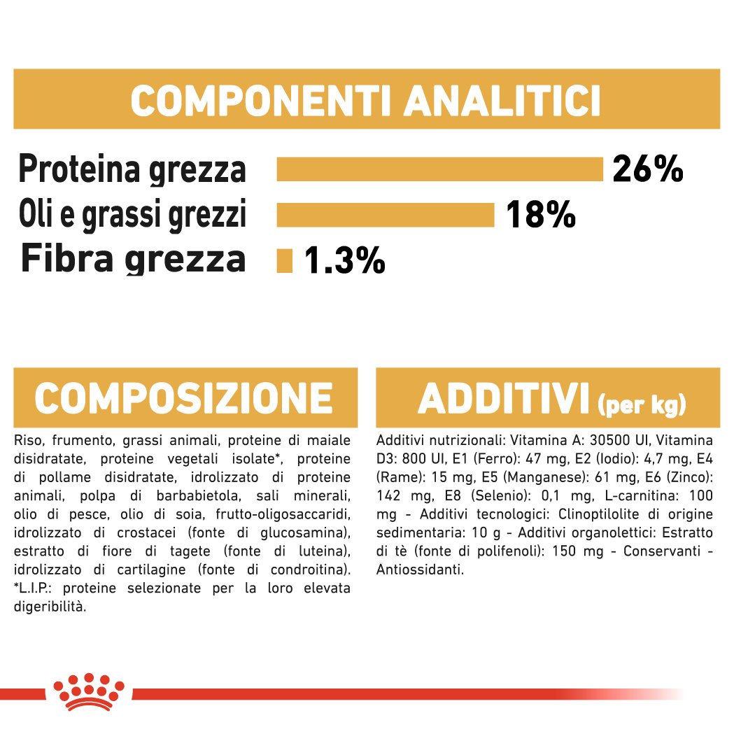 French Bulldog Adult contribuisce al mantenimento delle masse muscolari grazie al contenuto adattato di proteine (26%).
