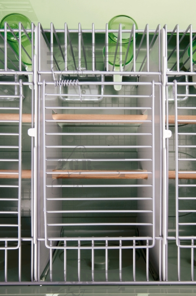 Trasportino fino a 5 posti per ondulati, con mangiatoie interne e beverini esterni e chiuso nel retro del trasportino