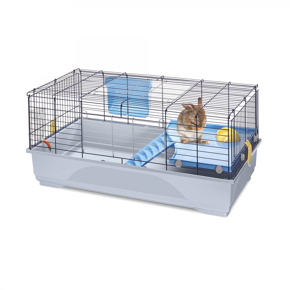 Della serie Ronny la 100 � la gabbia intermedia, di medie dimensioni per conigli e cavie. Il fondo in plastica particolarmente capiente per contenere la lettiera, � unito tramite due comode clip alla struttura in rete metallica verniciata. L�habitat � dotato di un ripiano interno in plastica agganciato alla rete, accessibile dal fondo tramite una comoda scaletta. Completano la dotazione interna gli accessori quali ciotola in plastica Fun Bowl, mangiatoia esterna per il fieno Feel e il beverino Bibber 400 con pratico aggancio alla rete. Le due ampie aperture, una superiore e una frontale, vi consentono di raggiungere facilmente il vostro animale all�interno della gabbia.