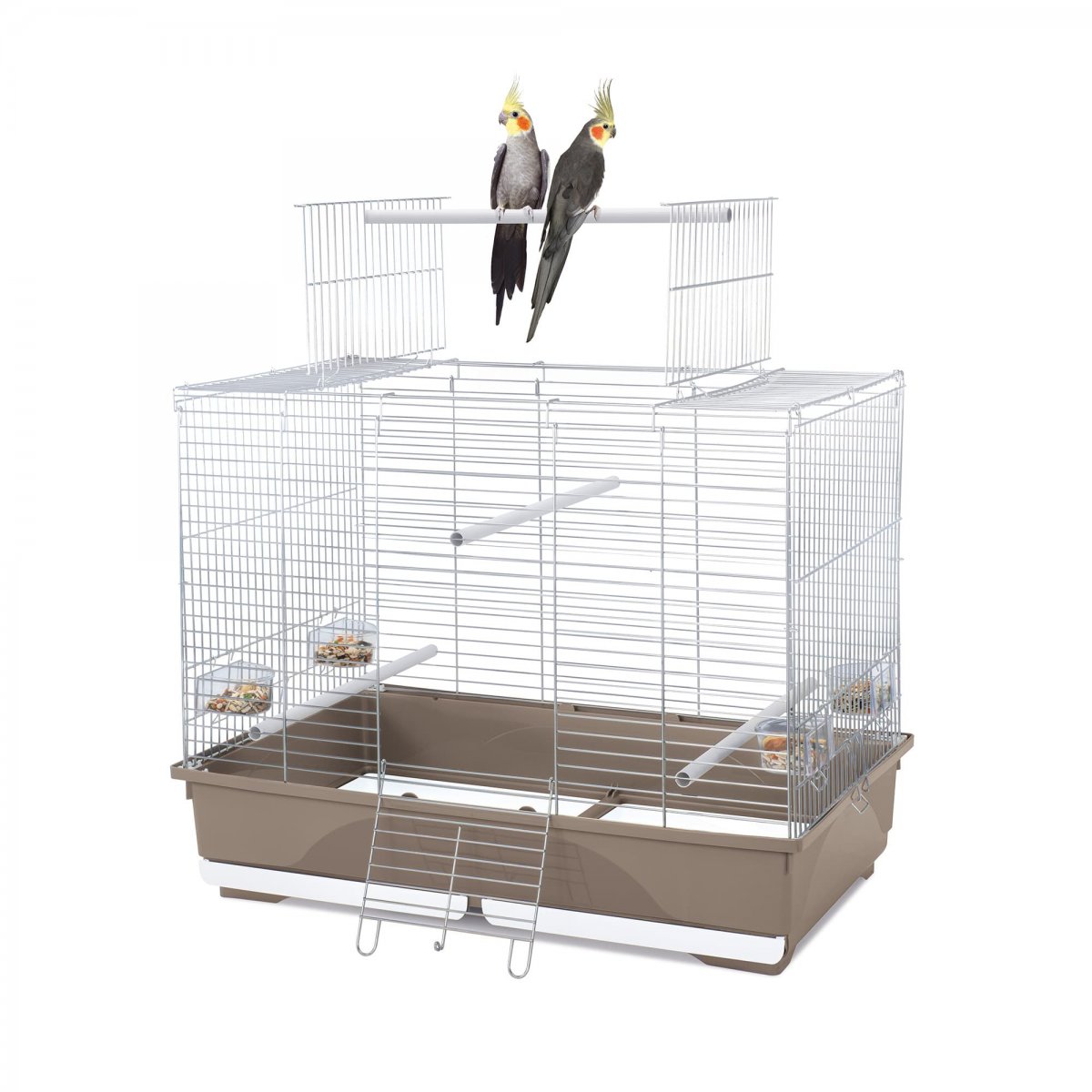 Gabbia dalle dimensioni ampie a base rettangolare per calopsiti e parrocchetti. L�apertura sul tetto della struttura in rete metallica zincata, rende questa gabbia il luogo ideale per il tuoi uccelli che potranno godere di un grande comfort e libert� di movimento. Ponendo il posatoi tra le due aperture il tuo amico volatile sar� libero di uscire e tornare alla gabbia in base alle sue esigenze. Il fondo in robusta plastica di colore tortora dispone di due cassetti estraibili per rimuovere facilmente sporco ed escrementi. L�ampia apertura frontale ti consentir� di accedere alla gabbia per inserire il cibo. Wilma viene fornita completa di mangiatoie Parrot e posatoi, accessori pensati per la tipologia di uccelli per cui questa gabbia � stata progettata.