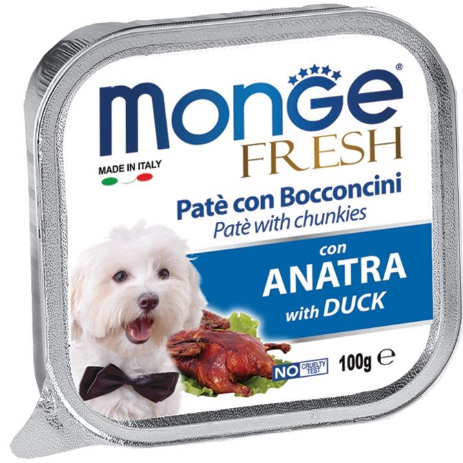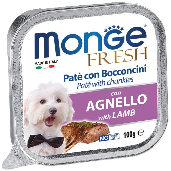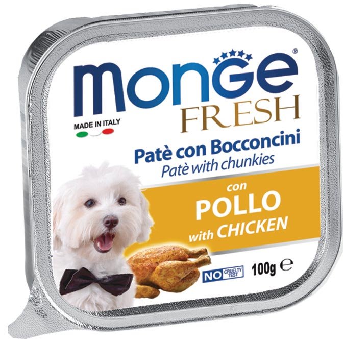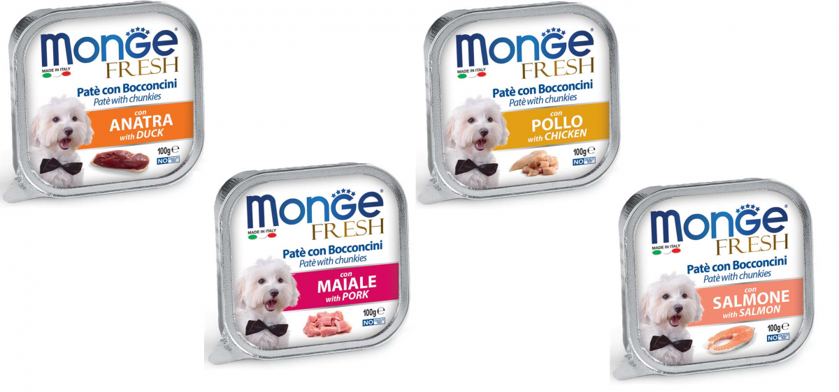 Monge Superpremium Fresh Paté e Bocconcini di cibo umido per cani ha un cuore di prelibati bocconcini con carne fresca selezionata, senza coloranti, conservanti e grassi idrogenati e a basso tenore di zuccheri, per offrire al tuo Fido il benessere quotidia