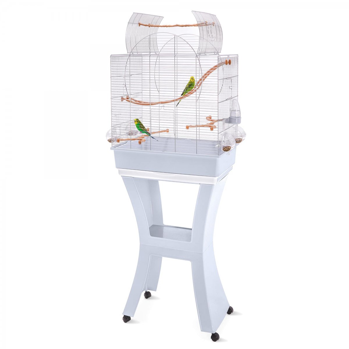 Matilde gabbia per canarini, cocorite e uccelli esotici comprensiva di piedistallo con ruote piroettanti. La caratteristica di questa gabbia e il tetto tondeggiante apribile. Posizionando il posatoi a forma di ramo tra le due aperture questa gabbia diventa un rifugio per i vostri uccelli, liberi di volare via e di rientrare alla base a loro piacimento. Disponibile nei due abbinamenti di colore: rete ottonata con fondo e piedistallo in plastica marrone, oppure rete zincata e fondo e piedistallo in plastica colore ghiaccio. Per una praticissima pulizia della gabbia basta estrarre il cassettino dal fondo, mentre per accedere all�interno per una ordinaria manutenzione, Matilde dispone di tre aperture, una frontale e due laterali. Massimo comfort lo garantiscono gli accessori che completano questa gabbia: i posatoi a forma di ramo, la scaletta tibetana, le mangiatoie Mia e il beverino Tweety.
